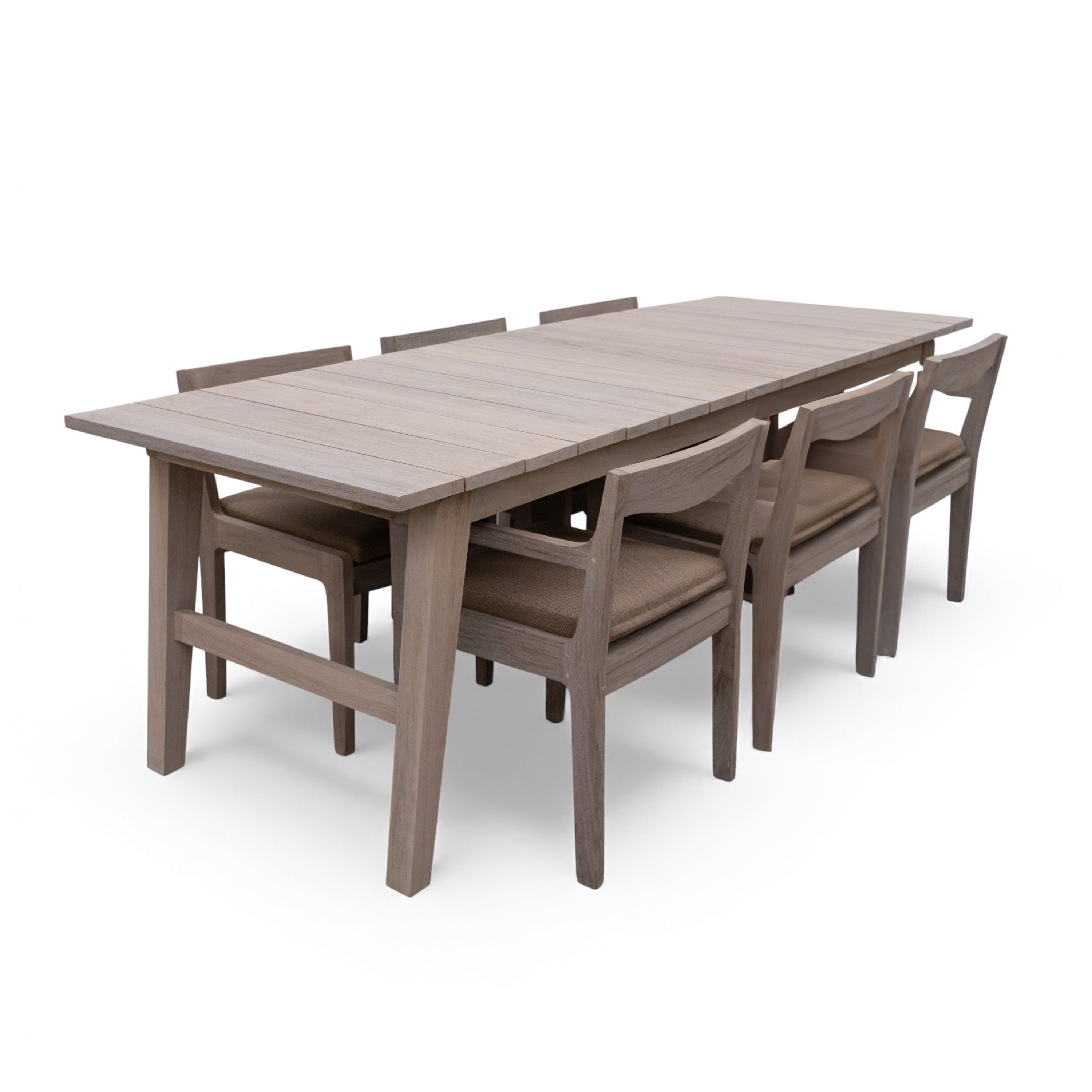 The Athena Weathered Teak Outdoor Dining Table Set seamlessly combines timeless elegance with a relaxed, rustic aesthetic. Expertly crafted from premium A-grade teak, this set features a wire-brushed Golden Care finish, imparting a beautifully weathered appearance from the outset—no aging required. Designed with both comfort and style in mind, it includes a seat cushion customizable in your choice of fabric from our Neptune Fabric Collection, ensuring durability and a personalized touch.