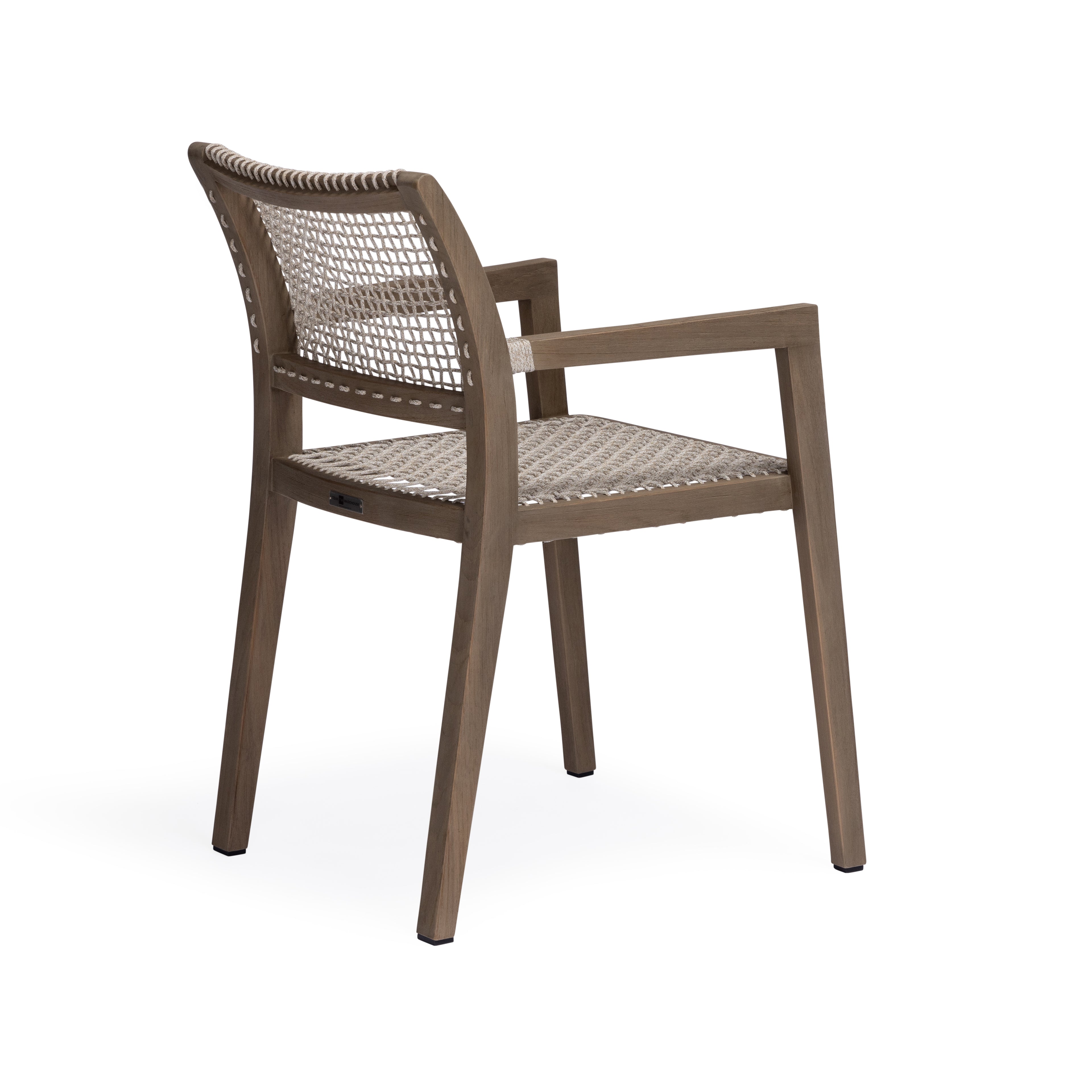 The Palo Dining Arm Chair brings refined beauty to outdoor dining with its rustic warmth and contemporary design. Made from A-Grade teak, the frame is finished in Golden Care® Taupe, highlighting the wood’s organic texture while providing lasting protection. The seat and back are wrapped in outdoor-grade, all-weather rope, offering a comfortable, breathable surface that’s built to withstand the elements. With its gently sloped arms and minimalist profile, the Palo Chair pairs effortlessly with both rustic and modern dining tables. No cushion or assembly required. Designed to seamlessly integrate with other pieces in the Palermo Reclaimed Collection, this corner piece enhances any outdoor space with both form and function.
